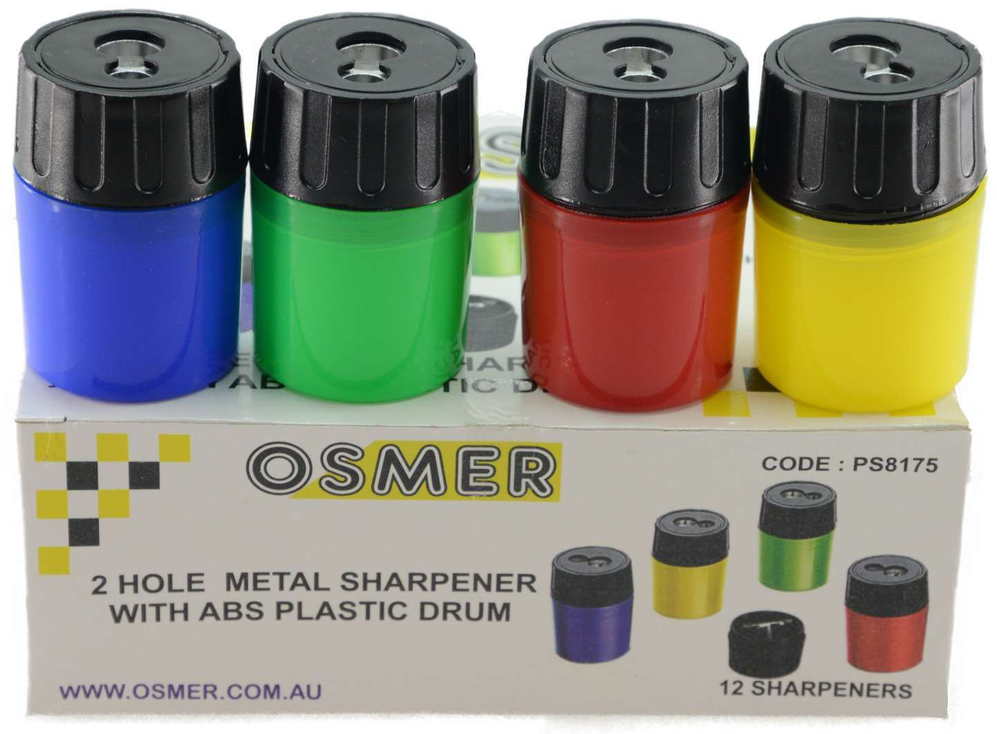 2 Hole metal sharpener in high quality ABS plastic drum. Assorted colours to choose from - Blue, Red, Green and Yellow.