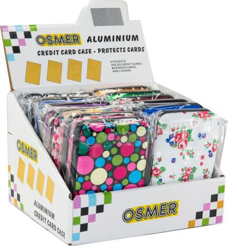Aluminium credit card case - 11 different designs/colours. 6 pockets hold credit cards, business cards and licences. Protects from scanning, Easy to carry.