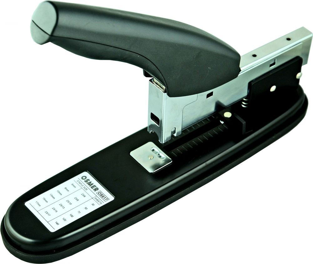 Osmer Heavy Duty Stapling Machine. Uses 23/6 up to 23/17 staples - 17mm leg length. Staples up to 140 sheets of 80 gsm copy paper. Available in black. Ergonomic handle for more comfort.