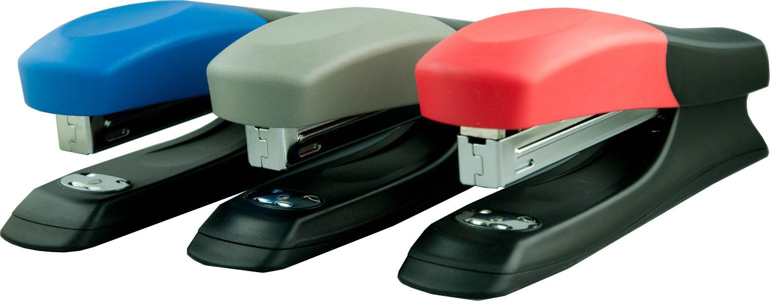 Uses standard 26/6 or 24/6 staples. Reversible anvil for pinning or stapling. Easy loading metal draw back bar. Soft rubberised top and plastic body. 3 Assorted Colours - Blue, Red and Grey.