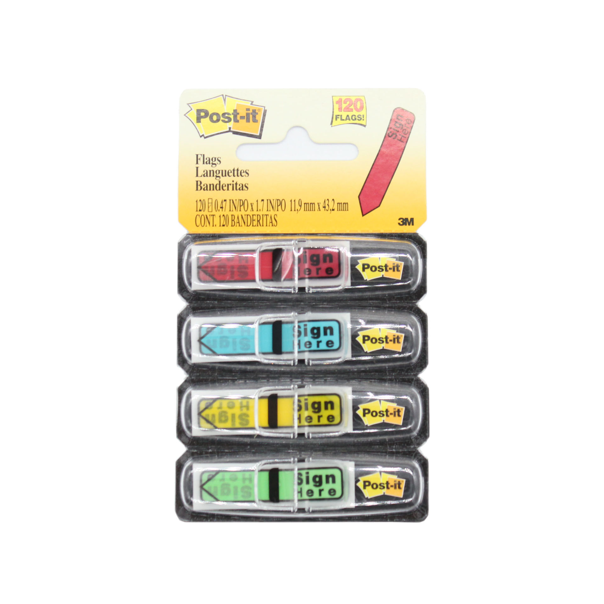 Post-it message flags with "sign here" messaging in assorted colors and 1/2 in wide size are ideal for marking documents without writing on them. They stick securely and remove cleanly without damaging documents. The dispenser keeps flags organized and easy to find.