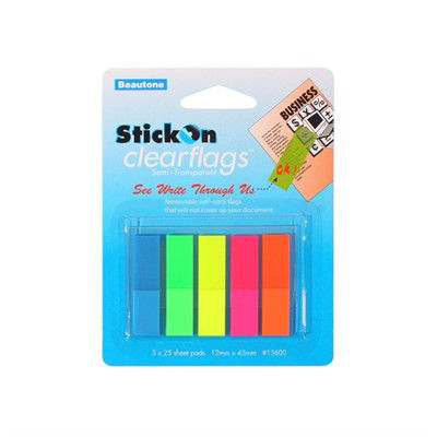 Stick On clear flags help to immediately get attention. Semi-transparent film in hot see-through neon colours allows you to identify your information with greater detail. Perfect for tabbing, indexing and page marking. Self-adhesive, removable and repositional.