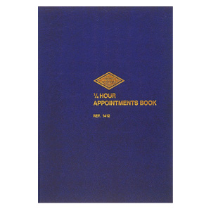 A quality book with 1/4 hour appointment times from 8.00am to 9.00pm. Daily appointments for up to 10 operators. Suitable for professional offices, doctors surgeries, hairdressers etc. Fully case bound book, 192 pages, section sewn, printed in blue ink on quality ledger paper
